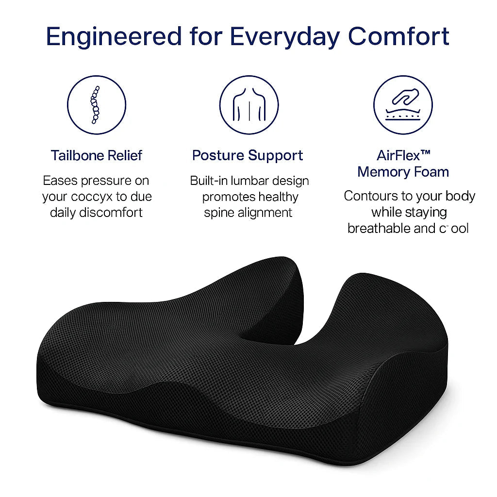 Relieves tailbone pressure, aligns your spine, and keeps you pain-free on long drives — used by 10,000+ happy customers.